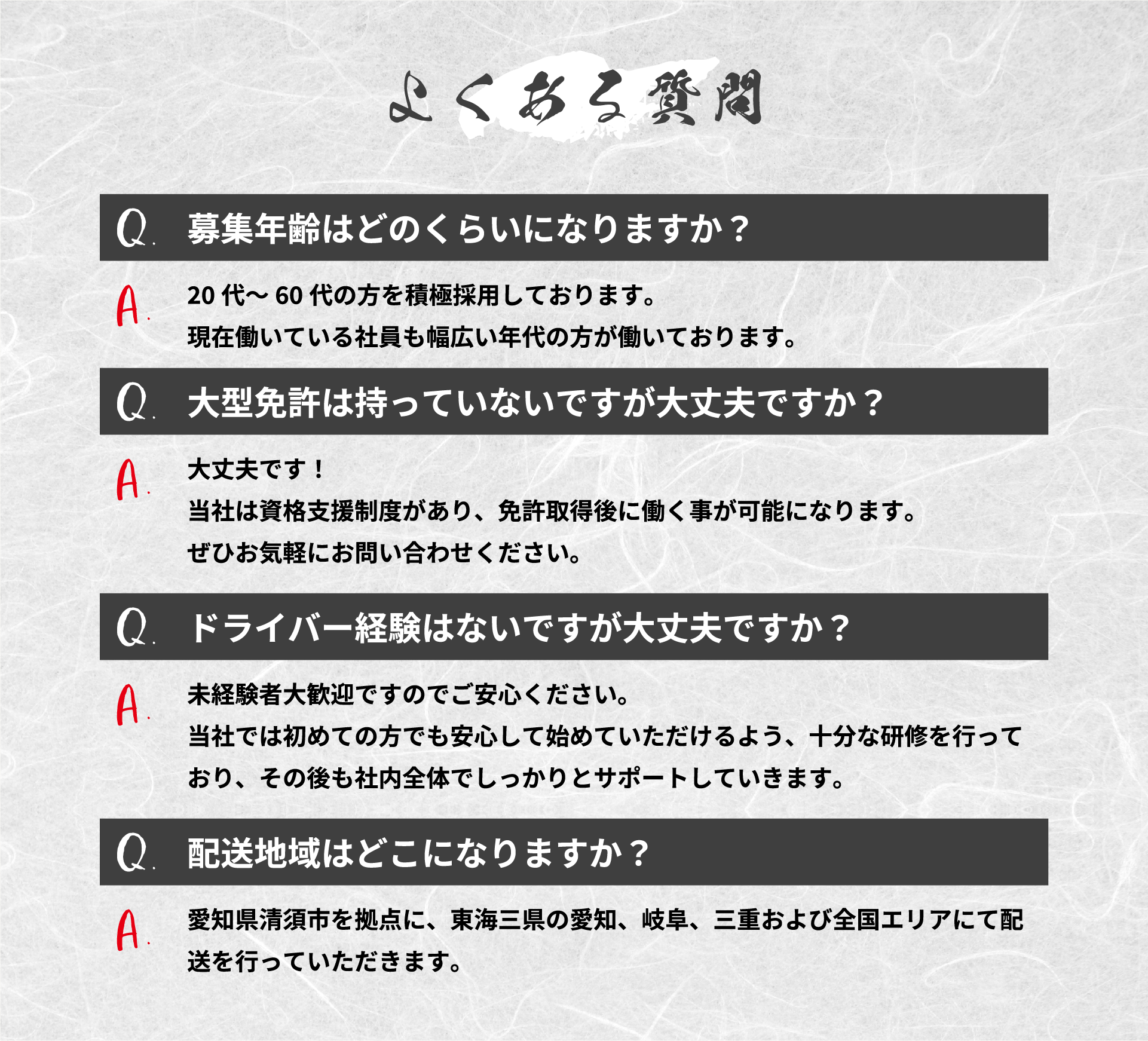 | 応募資格 | 自動車免許 ※積載量により応必要免許 |